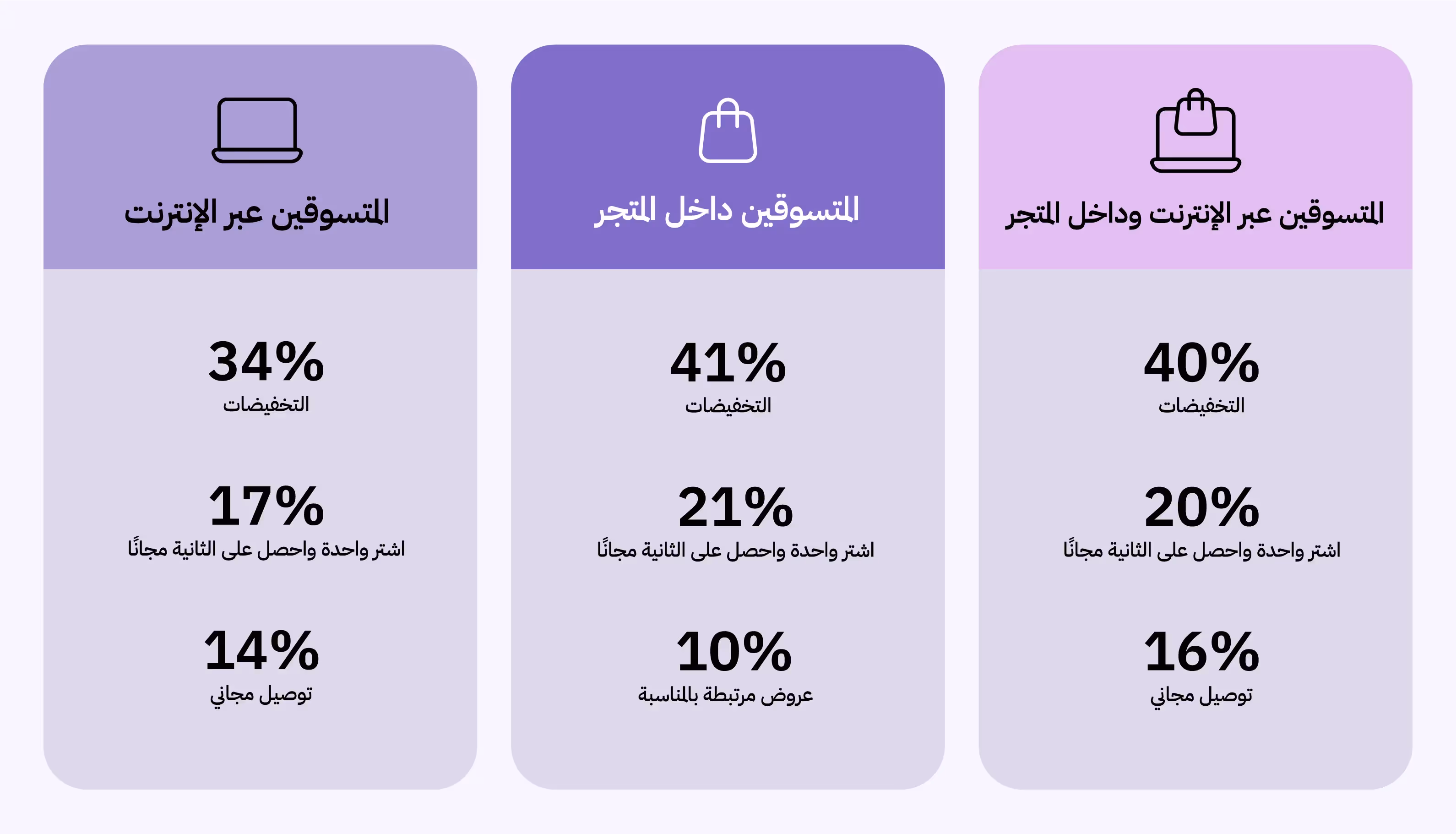 عبر جميع التصنيفات سواء أونلاين او داخل المحل، العروض والخصومات دائما تكون في المقدمة في تأثيرها على العميل ويتبعها: